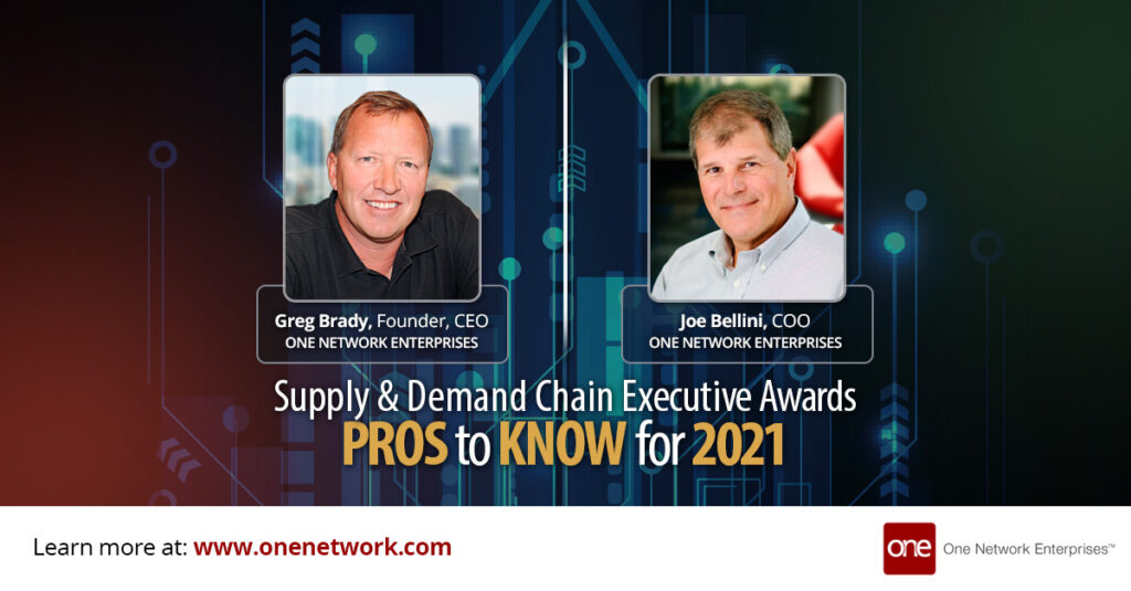 Dallas TX, March 24, 2021 — One Network Enterprises, a global provider of multi-party business networks for autonomous supply chain management, today announced that that the Company’s top two executives have been named 2021 Pros to Know by Supply & Demand Chain Executive Magazine, the executive’s user manual for successful supply and demand chain transformation and the only publication covering the entire global supply chain. Two-time winner and One Network’s Chief Operating Officer Joe Bellini joins three-time winner, Founder and CEO Greg Brady on this prestigious list of supply chain professionals.