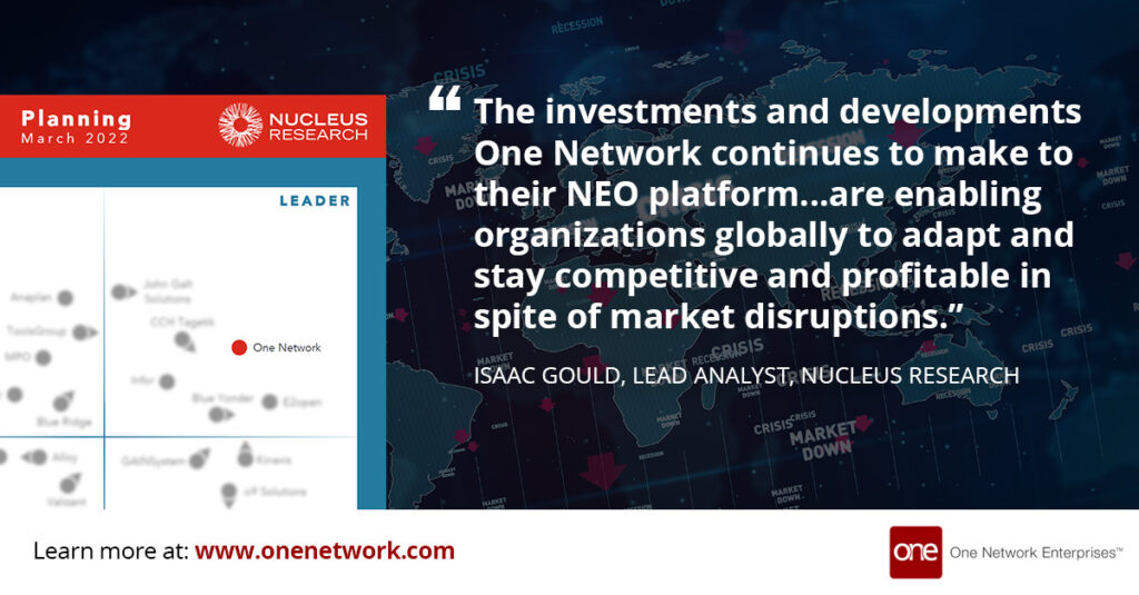 “We are proud to once again be recognized by Nucleus Research as a leader in the 2022 Supply Chain Planning Technology report,” said Mark Brady, CEO of One Network Enterprises. “As Nucleus Research has highlighted, the ongoing improvements we are making to supply chain planning functionality is having a major impact on the resiliency of global supply chains. In today’s volatile business environment, quickly resolving supply chain disruptions is of critical importance. Our enhanced NEO intelligent agents better predict and resolve issues, to further improve supply chain resilience with autonomous decision-making and control.”