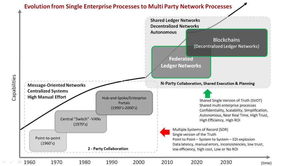 Blockchains and networks provide a grand opportunity for realizing the vision of supply chain control towers. The ability to orchestrate entire trading partner networks and optimize the consumer and customer experience across all parties is becoming vital for companies to remain competitive and adopt new business models. Blockchains are enabling multiple parties to engage in trusted transactions and data relationships that were difficult or near impossible with the “walled garden” and EDI approach companies have been investing in for the past 15 years.